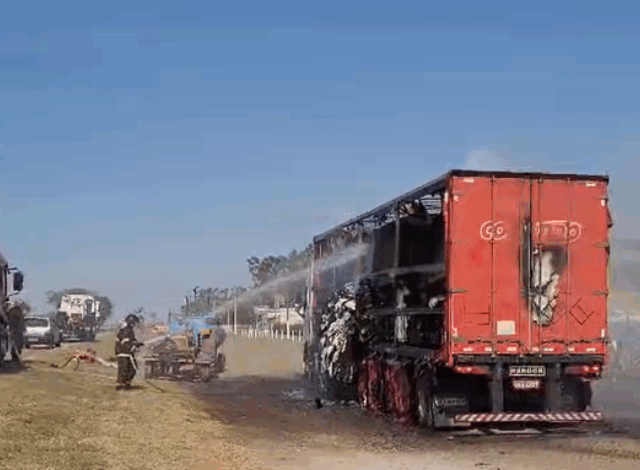 Avisado por outros caminhoneiros, o motorista estacionou a carreta à margem da rodovia e acionou o Corpo de Bombeiros que, com a ajuda de caminhões pipa de fazendas vizinhas, logo controlou o fogo.