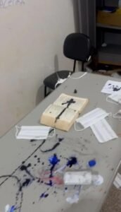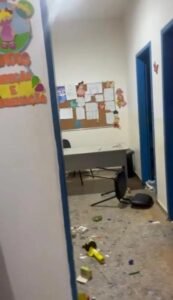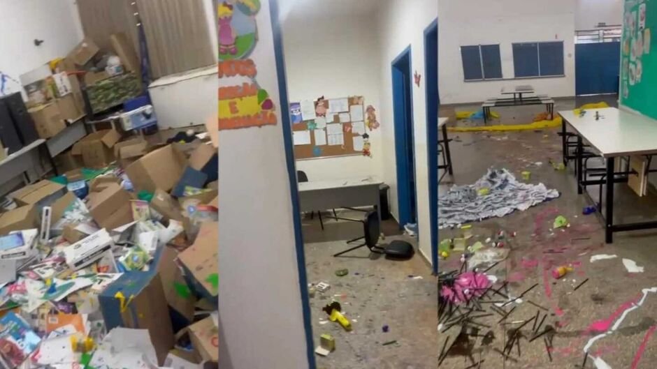 Ainda segundo o site, o cenário encontrado era de total desordem. Vídeos gravados no local mostram salas de aula e a secretaria cobertas por tinta colorida, papéis picados e materiais escolares destruídos. Além da sujeira, foram registradas pichações com frases ofensivas e desenhos obscenos nas paredes, atingindo até mesmo decorações de Natal que ainda estavam no prédio.