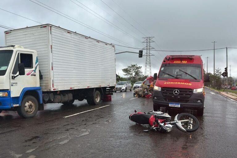 Um acidente entre dois carros, caminhão-baú e uma motociclista deixou um rapaz ferido em meio à chuva na Avenida Ministro João Arinos, no bairro Tiradentes, em Campo Grande, no fim da manhã desta terça-feira (9).