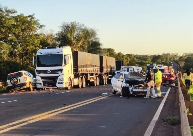 O acidente envolveu quatro veículos, sendo um Fiat Palio vermelho, um Hyundai HB20 branco, uma Chevrolet Spin branca e uma carreta VW/Meteor. As circunstâncias exatas da colisão ainda estão sendo apuradas.