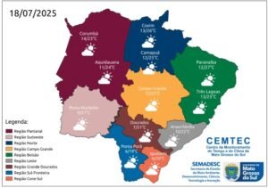 Nas regiões sudoeste e pantaneira, as mínimas devem variar entre 6°C e as máximas entre 19°C. Já nas regiões do bolsão, leste e norte, os termômetros devem registrar mínimas entre 12°C e 16°C e máximas entre 25°C e 31°C.