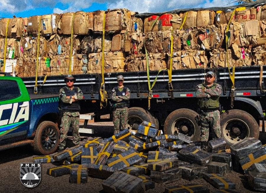 Em uma inspeção minuciosa, a equipe localizou diversos fardos ocultos em meio à carga de papelão. Após a verificação, foi confirmado que os volumes continham substância análoga à maconha, estrategicamente camuflada para tentar burlar a fiscalização policial.