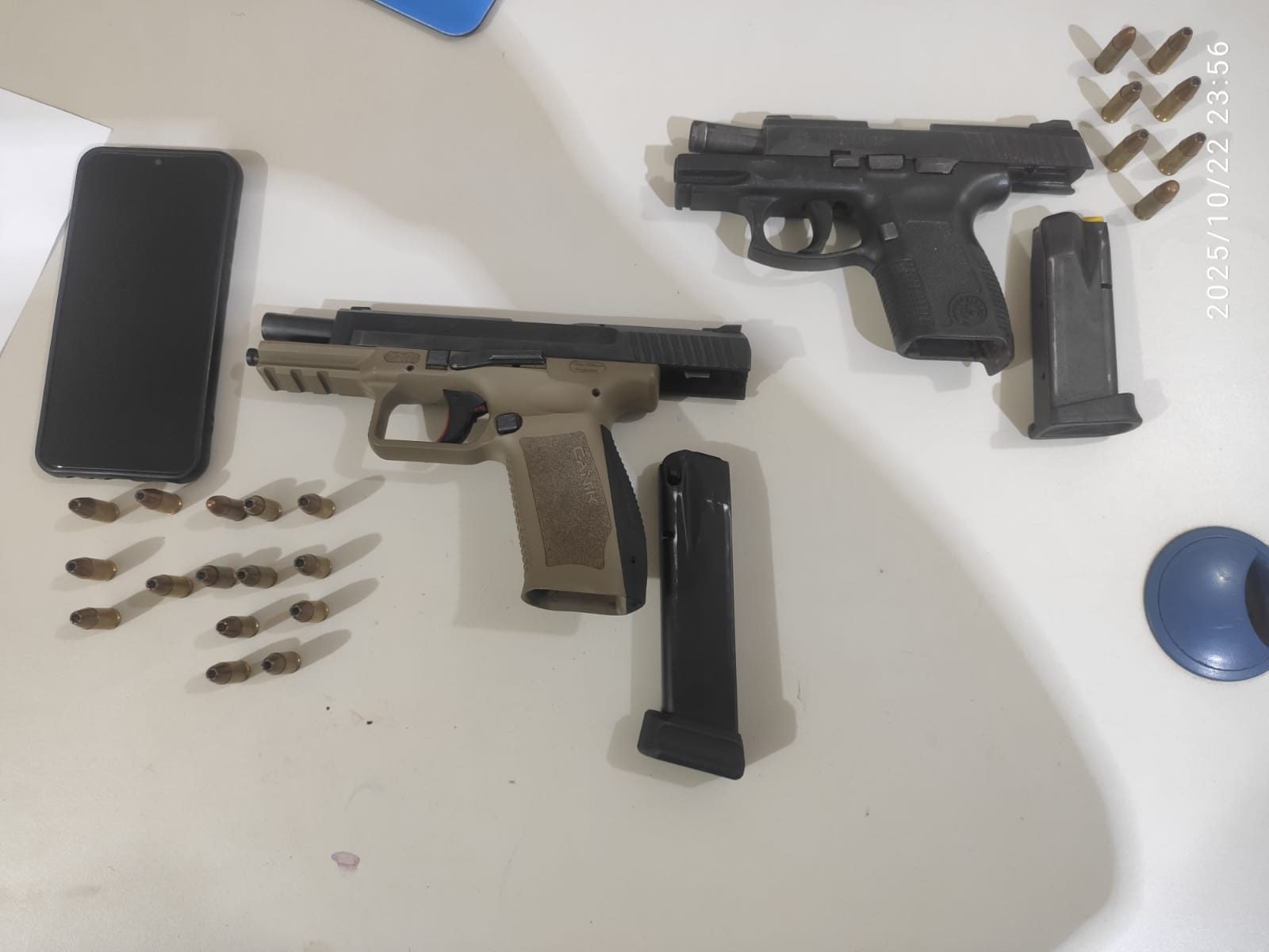 Com W.V.F.R. os policiais encontraram as duas pistolas de calibre 9mm, sendo uma da marca Taurus, com número de série aparente, e outra da marca Canik, com a numeração suprimida. Além disso, foram localizadas de 22 munições e um aparelho celular.