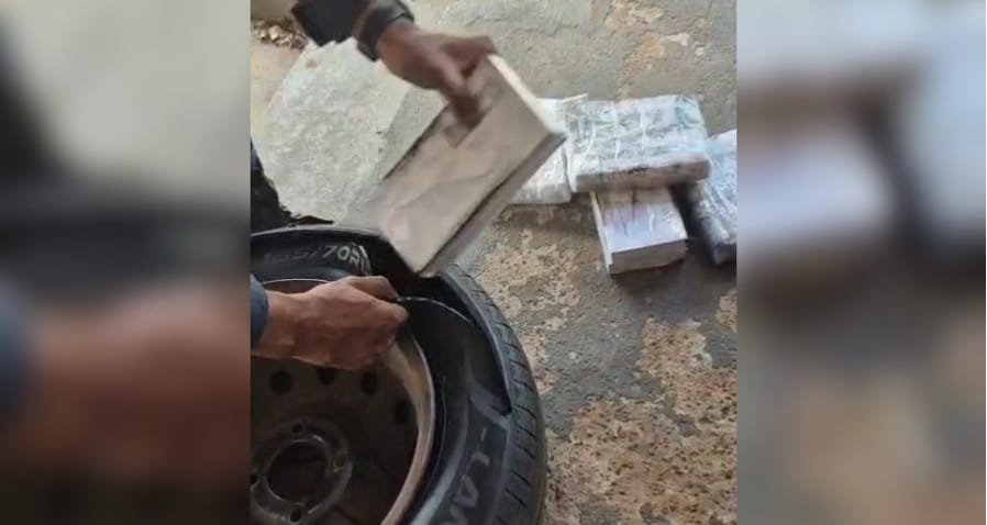 Durante a fiscalização, os policiais localizaram, ocultos no compartimento do estepe, medicamentos de origem estrangeira cuja entrada e comercialização no país é proibida, caracterizando crime de contrabando.