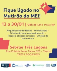 A Prefeitura de Três Lagoas reforça aos microempreendedores individuais (MEIs) do município que o Mutirão do MEI entra em seus últimos dias de atendimento, com prazo final em 30 de janeiro, oferecendo serviços gratuitos de orientação, regularização e formalização.