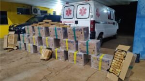 Dentro do veículo, os policiais encontraram várias caixas repletas de tabletes de maconha. A carga e a ambulância foram encaminhadas à Delegacia de Polícia Civil em Água Clara.