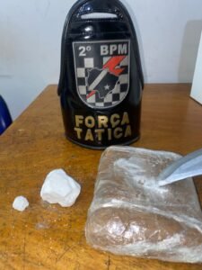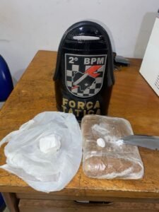 Durante busca perimetral os militares localizaram um “tablete” e um invólucro em uma sacola plástica com substância análoga a cocaína (pesando 558 gramas), sendo lhe dada voz de prisão e realizado sua condução até a Delegacia de Polícia onde foi apresentado juntamente com a droga apreendida.