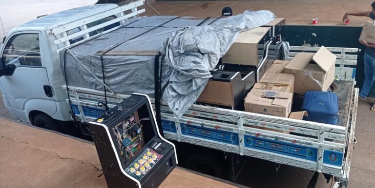No local, os policiais constataram na carga do caminhão a existência de aproximadamente 60 máquinas caça-níqueis, sendo aproximadamente 45 delas com monitor de vídeo, e 15 sem monitor de vídeo.